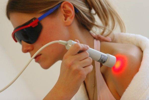 - Лазеротерапия. Помогает уничтожению патогенных микроорганизмов на поверхности пораженного участка, улучшает состояние кожи после прорыва гнойника. Имеет обезболивающий эффект.