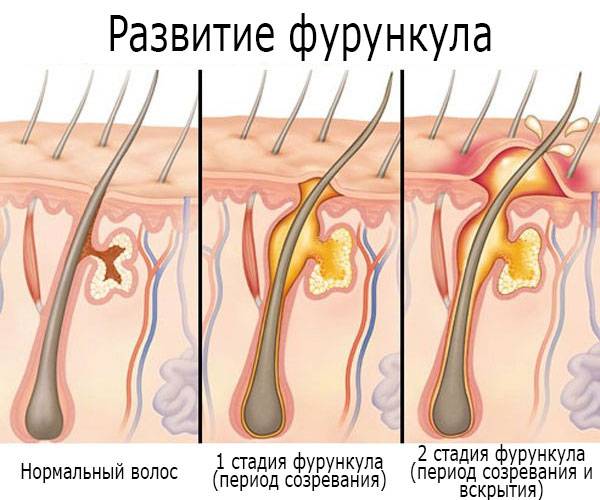 Развитие фурункула происходит в 3 стадии, длительность которых при отсутствии осложнений составляет до 10 дней: