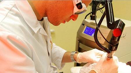 - Лазером. Для этого используют специальный сфокусированный луч, его направляют на образование, максимум, на минуту. За это время лазер буквально высушивает папиллому;